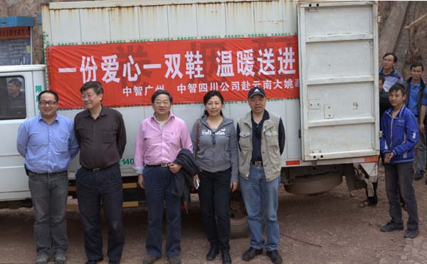为响应中智公司党委发起的关于为云南贫困地区中小学募捐的倡议,2013年3月11日,中智四川公司总经理李小林、副总经理任洁、中智广州公司总经理刘青龙、中智湖北公司总经理崔建新,代表中智四川、广州、湖北公司赴云南省大姚县开展爱心捐赠活动,为云南省大姚县湾壁中学、壁拉笮小学、罗士刀小学送去1200双运动鞋及一批体育用品。希望通过此次爱心捐赠活动,尽我们的绵薄之力,让更多贫困儿童收获喜悦和爱心,在梦想之路上越走越远。